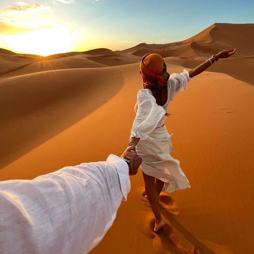 After breakfast, depart the Dades Valley and follow the road toward the towering cliffs of the magnificent Todra Gorge, a paradise for walkers and photographers. Continue your journey through traditional Berber villages and the oasis town of Tinjdad before reaching the desert gateway of Erfoud, known for its unique fossil workshops. Arrive at the edge of the golden dunes of Merzouga, where a caravan of camels awaits. Embark on a serene camel trek across the glowing Erg Chebbi dunes, witnessing one of the most magical sunsets in Morocco. Settle into your desert camp for a traditional dinner, local music, and a peaceful night under the star-filled Sahara sky.